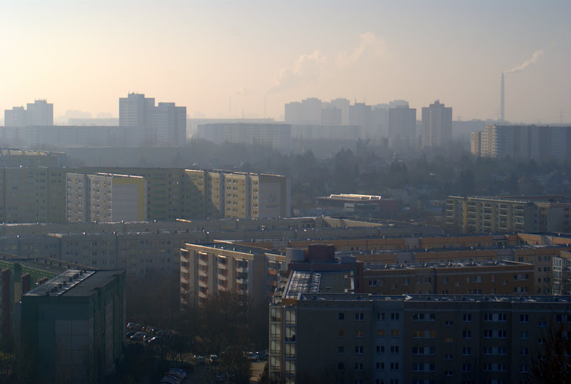 Man blickt in den Dunst, sucht irgendwo westlich den Fernsehturm, diesen heimatanzeigenden Leuchtturm, wenn man aus der anderen Richtung blickt, und denkt sich, was haben sich die Architekten, die das Wohnungsbauprogramm ästhetisch umsetzen sollten, nur gedacht?